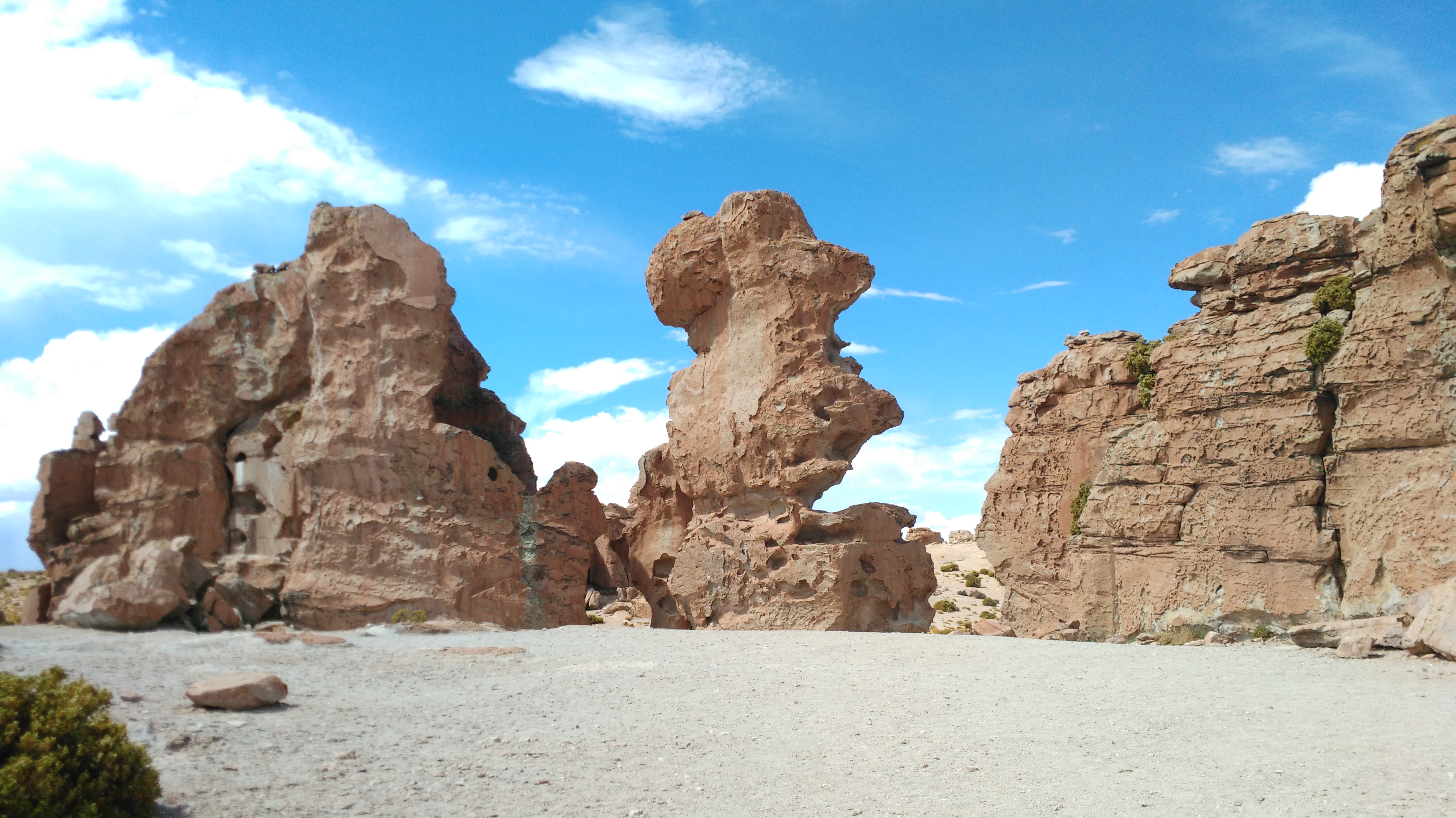 Rocas enormes y rojizas se alzan desde la tierra con formas caprichosas ante nuestros ojos. Algunas son medianas y tienen un agujero en el medio, otras tienen forma de árbol con una base delgada y una copa gruesa. Estamos en el Valle De Rocas, cerca del pueblo de Uyuni, pero en seguida continuamos nuestra marcha en la camioneta 4×4 verde oscuro con la que realizamos una excursión de tres días. Bernardo, el guía, no domina por completo el español debido a sus raíces con los pueblos originarios, pero es muy amable y cómico con nosotros. Su buena onda es proporcional al esfuerzo que ejerce en su trabajo, un manejo de 12 horas al día parando solamente para comer y brindar información a los turistas. Su única compañía en esta ardua tarea, además de nosotros, es una bolsa de coca que lo mantiene activo desde la madrugada hasta la noche.