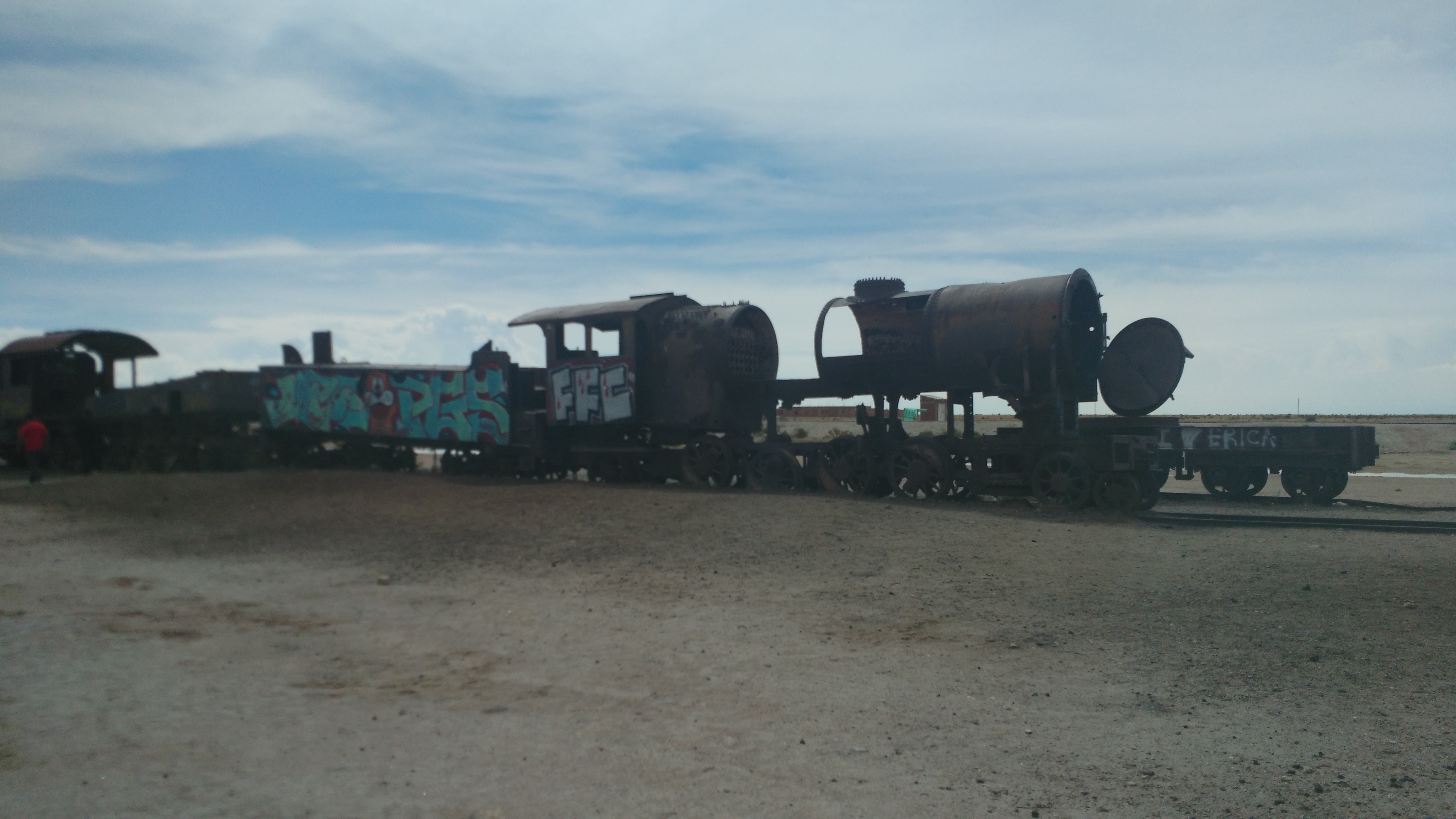 Todos se quitan los miles de granos de sal pegados a los pies y la camioneta arranca con dos pasajeros menos en su interior. Mi amigo y yo ahora contemplamos nuestro alrededor desde el techo de la máquina con el viento pegándonos en la espalda. Nos damos cuenta de que además del punto de vista la situación tiene otra ventaja: ya no tenemos que escuchar la música de Bernardo. Dos lugares turísticos más cerrarán el día. El primero es el Hotel Playa Blanca, pionero en asentarse en medio del salar y con un monumento del Dakar, ya que este evento incluyó la zona el año pasado por quinta vez consecutiva. El segundo es el cementerio de trenes, donde hallamos abandonadas y oxidadas locomotoras a carbón que fueron compradas a Irlanda en 1890 para transportar los múltiples minerales de la zona.
