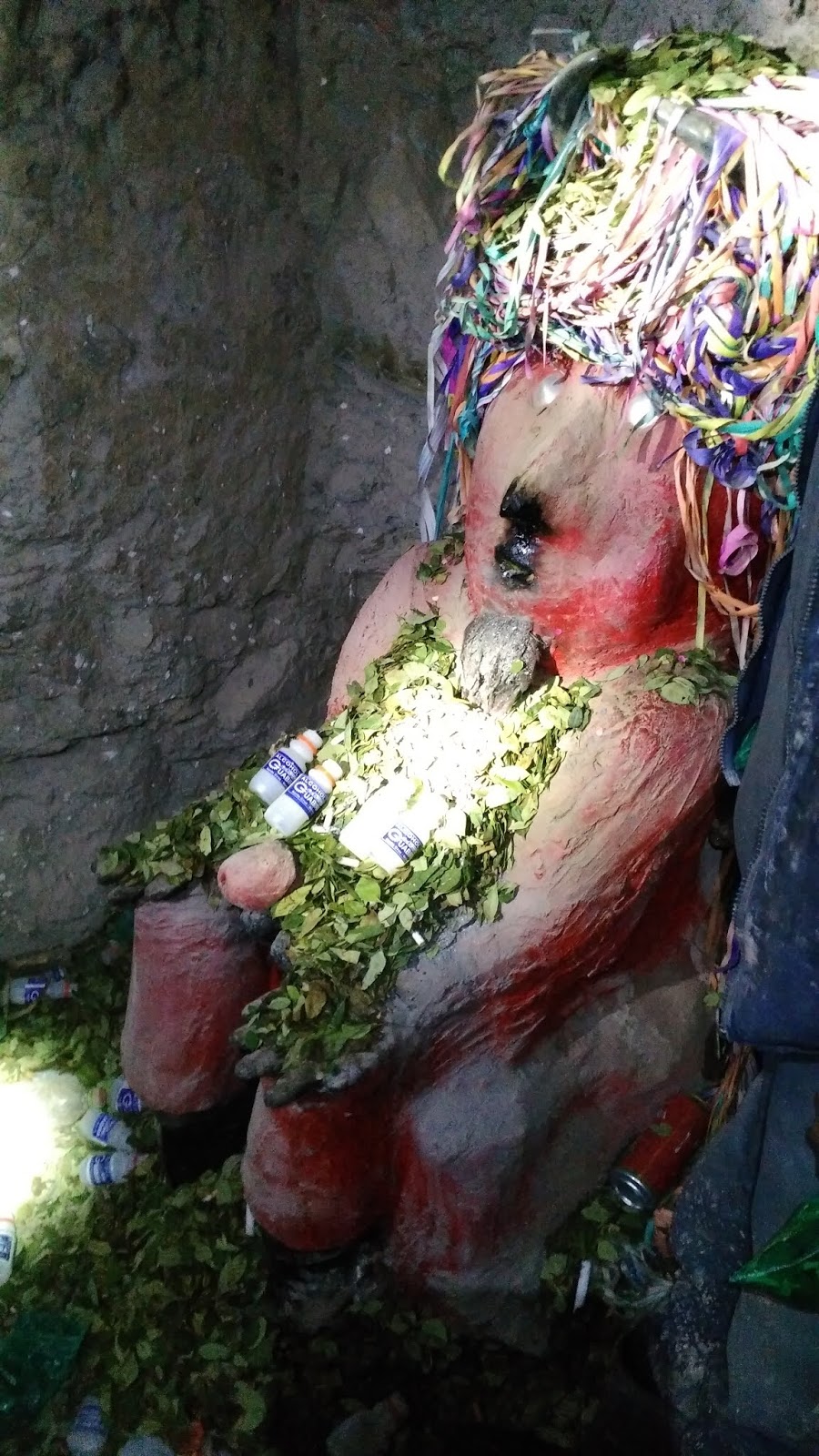 A un costado nos mira fijamente una figura monstruosa de color rojo vivo. Se trata del Tío Pachamama, una escultura diabólica que posee hojas de coca, tarros de alcohol etílico y cigarrillos que los mineros le ofrecen a cambio de su protección. La tradición consiste en volcar esos elementos en su cabeza, manos y su gran pene, este último representante de la fertilidad. A medida que avanzamos nos vemos obligados a mirar hacia arriba para esquivar las piedras y barrotes de madera que cuelgan del bajo techo, pero también debemos prestar atención hacia abajo para no resbalarnos con el barro o tropezarnos con las rocas. A los costados del camino pueden encontrarse pozos cuya profundidad no puede ser divisada, como también ventanas cuadrados que brotan de las paredes, los cuales se solían utilizar como conducto para despachar material, pero ahora se encuentran tapadas por diversos minerales que también han formado estalactitas en los techos con el paso del tiempo. Bajamos por uno de los pozos, los cuales no poseen ningún tipo de medida de seguridad más que la destreza de la persona que desciende con valentía. Unos cuantos metros más de caminata nos lleva a otro agujero ubicado en el techo por el cual nos trepamos. Mientras continuamos la marcha, la luz emitida por la linterna permite ver claramente el polvillo presente en el aire, el cual ahora entra más rápidamente a nuestros pulmones gracias a la acelerada respiración producida por el continuo esfuerzo.